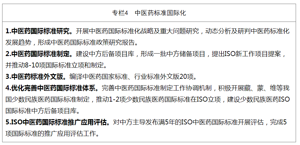 3.推动国内国际标准相互促进转化。加大中医药国际标准动态跟踪、评估力度,发展和推动满足国际应用需求的中国标准转化为国际标准,积极采纳引用培育适合我国国情的国际标准。开展中医药国内国际标准一致性评价。
