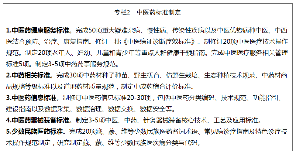 2.强化中医药国家标准和行业标准。提高基础通用、与强制性国家标准配套、对行业起引领作用的国家标准以及中医药行业的产品、技术、服务和管理标准的数量和质量,满足中医药发展需求,提高中医药国家标准、行业标准的通用性和覆盖面。