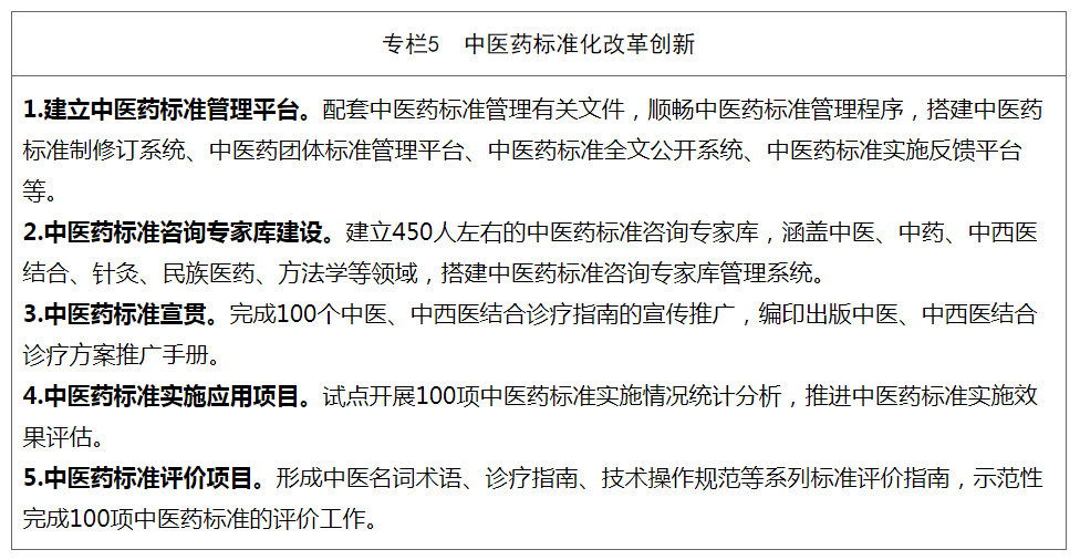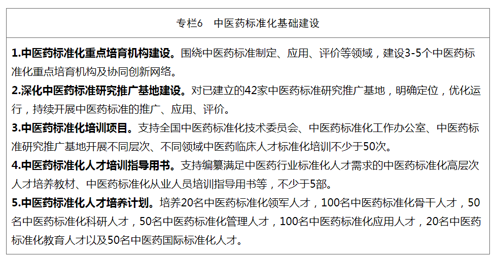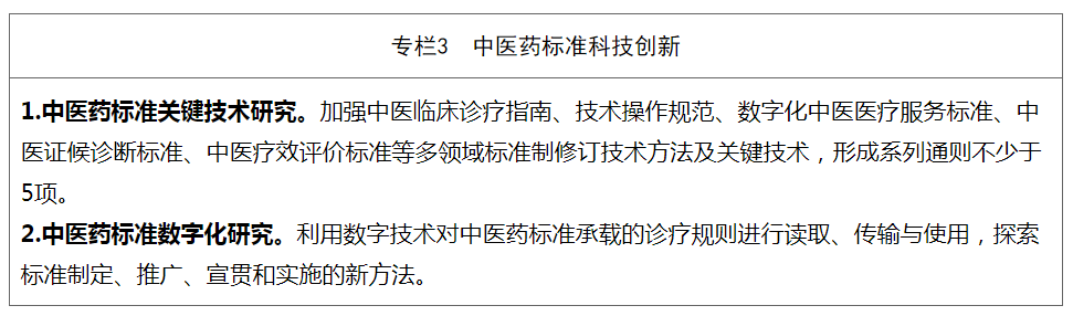 1.深化中医药标准化理论、方法、技术研究。夯实中医药标准科研基础,利用科技创新助推标准水平提升,推进中医药标准化方法、原理创新,开展中医药标准全生命周期的共性技术研究,围绕中医标准制定的关键技术环节,形成系列共性关键技术通则,显著提升共性关键技术标准数量。
