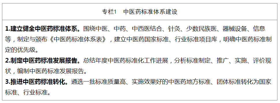 1.建立健全中医药标准体系。动态研究分析中医药标准需求和标准化工作发展趋势,合理界定各层级、各领域标准的制定范围,建立健全协调统一、系统配套、规模适度的中医药标准体系,提高中医药标准供给效率,加快中医药标准更新速度,不断提升中医药标准质量。