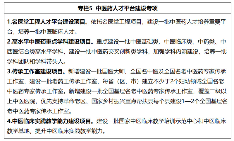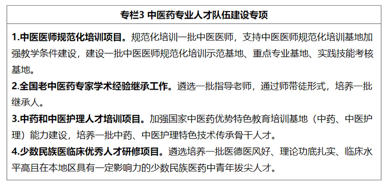 (一)培养中医药急需紧缺人才。依托国家中医疫病防治基地、中医紧急医学救援基地,打造中医疫病防治队伍和紧急医学救援队伍。持续推进中医药应对重大公共卫生事件和中医疫病防治骨干人才库建设。鼓励高等院校和科研院所等开展中医药宏观战略政策研究。服务中医药综合统计制度和信息化建设,加强中医药统计和信息化人员配备,实施中医药统计和信息化人才培养项目。