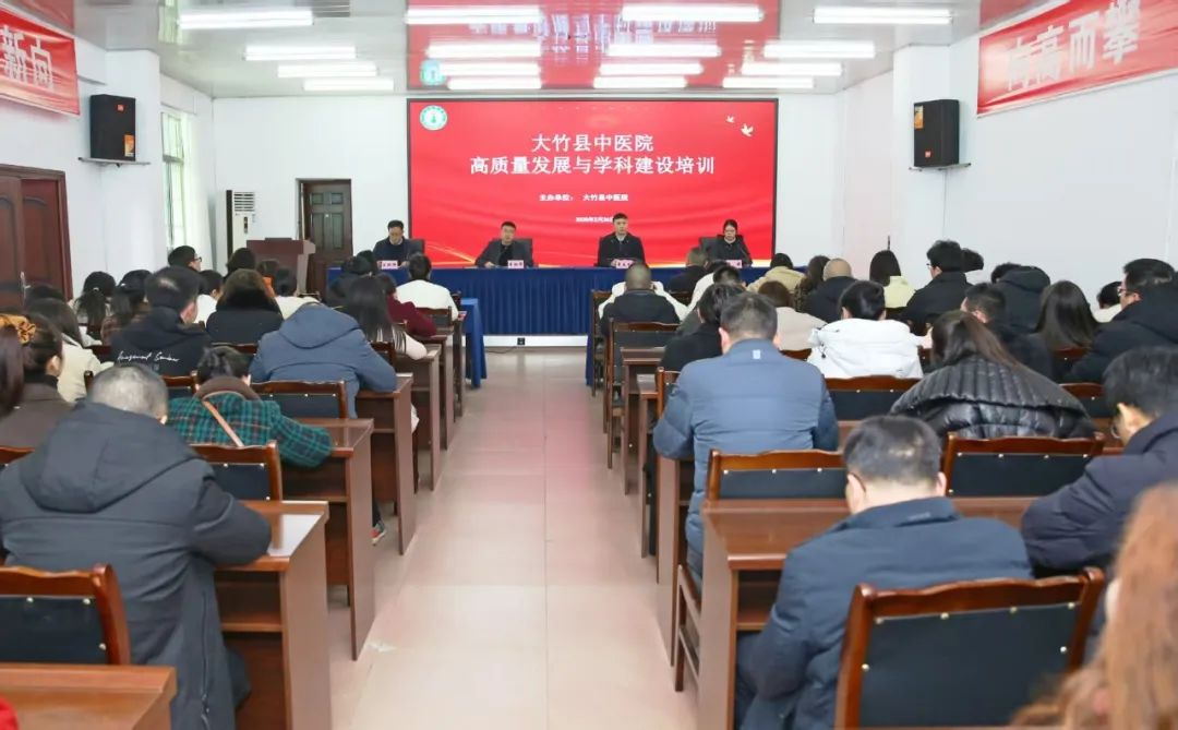 2025年2月26日,大竹县中医院高质量发展与学科建设培训班(第四期)在大竹县中医院学术厅举办。世界中医药学会联合会科技发展委员会常务理事、四川岐黄天府中医药科技中心主任曾友元,科技中心科学技术部干事周婷应邀授课。会议由大竹县中医院党委委员、副院长李红军主持。