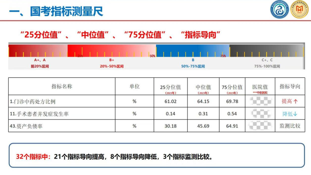 曾友元团队原创设计“国考指标测量尺”。该工具结合国家发布的区位值和分位值,能够测量出每项指标的档位分布情况(如A+、A、B+、B、C+、C),帮助医院明确自身定位及未来提升方向。通过对比医院数据与国家发布的“25分位值”“中位值”“75分位值”,科学预测医院整体情况及各个指标档位情况,制定针对性改进措施。
