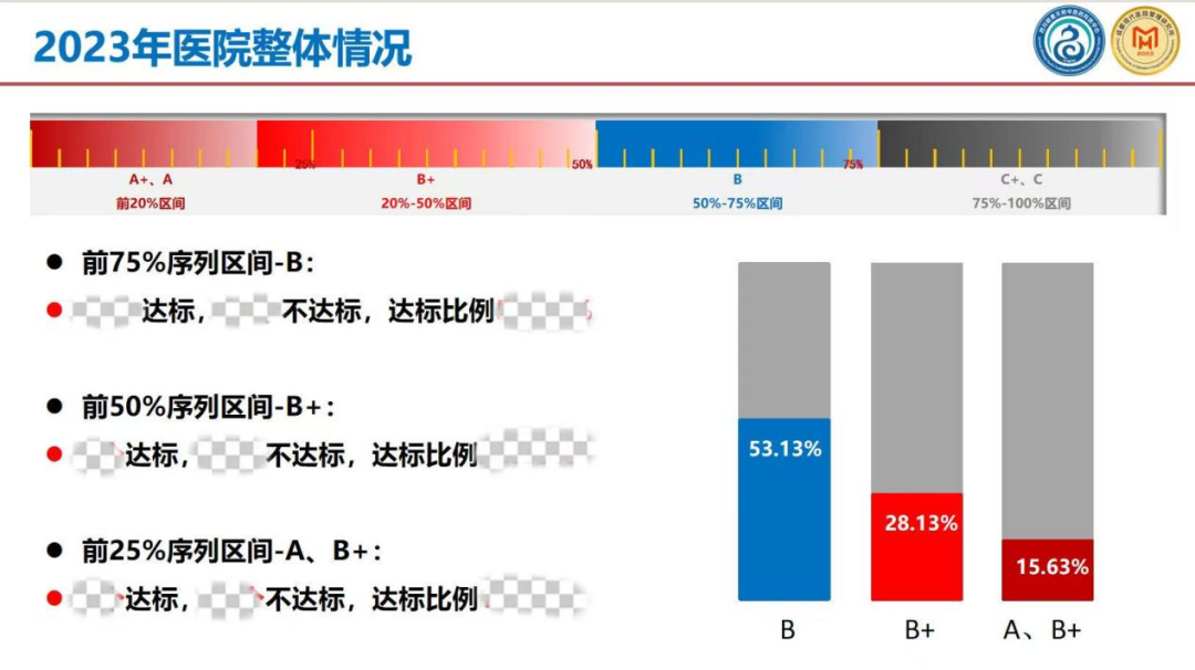 重点内容:解读国考等级区间分布,分析国考医院排名,解读区间值、分位值定义,按照国考指标三种导向,使用国考指标测量尺,分析医院国考数值,测算医院国考指标能够进入的合理区间值,分析国考指标达到的等级。统计分析出医院国考指标达标数、不达标数及达标比率。逐一分析国考指标,基于国考指标国家值、省级值,参照中位值,考虑指标同比提升或下降,分析医院指标值达标情况,根据该指标同比和环比数值,稳步推进指标达标工作。