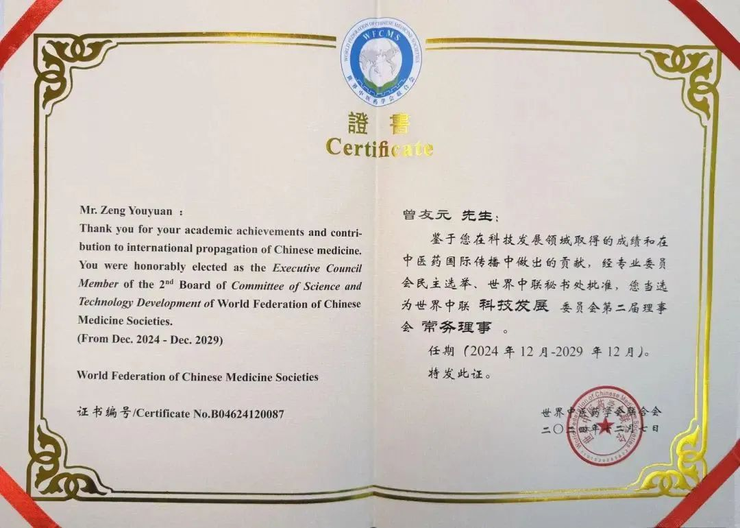 鉴于您在科技发展领域取得的成绩和在中医药国际传播中做出的贡献,经专业委员会民主选举,世界中联秘书处批准,您当选为世界中联科技发展委员会第二届理事会常务理事。