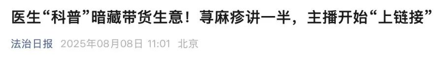 8月8日,中央政法委机关报《法治日报》发文,题目为《医生“科普”暗藏带货生意!荨麻疹讲一半,主播开始“上链接”》,就部分的医生“科普”乱象进行了调查。