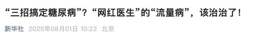 一周前,新华社以《“三招搞定糖尿病”?“网红医生”的“流量病”,该治治了!》为题,曝光部分“网红医生”以治病救人之名,行流量变现之实——推销“神药”;自称包治百病、无所不能;号称专家权威,擦边色情、收割流量……