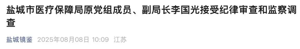 今日,据盐城市纪委监委消息,盐城市医疗保障局原党组成员、副局长李国光涉嫌严重违纪违法,目前正接受盐城市纪委监委纪律审查和监察调查。