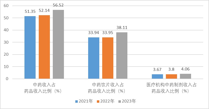 图7 2021-2023年三级公立中医医院中药、中药饮片、医疗机构中药制剂收入占比情况