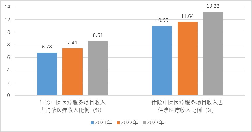 图6 2021-2023年三级公立中医医院门诊、住院中医医疗服务项目收入占比情况