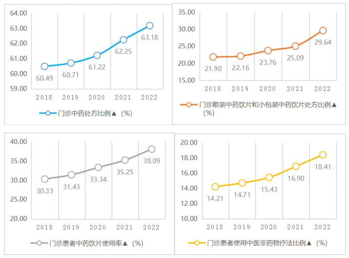 图2 2018-2022年 三级公立中医医院门诊特色指标变化情况